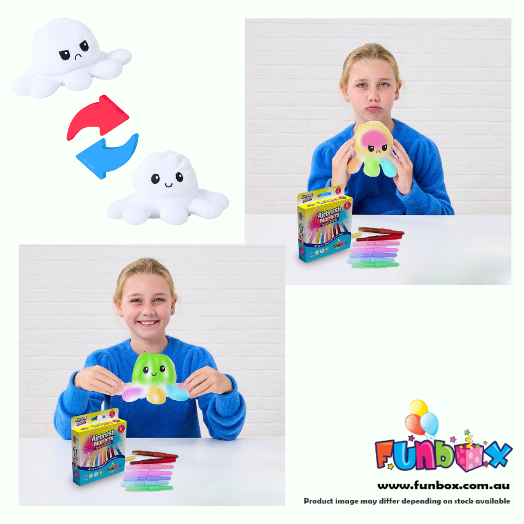 This pack includes a Reversible Mood Plush Octopus that flips from happy to sad, and a no-mess 8-pack of airbrush markers that let kids add their own colourful twist!