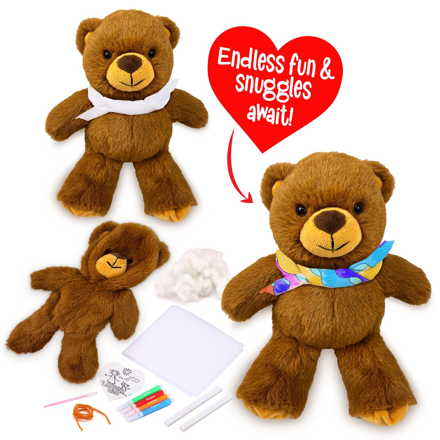 Our brand new Teddy Bear Stuffem is packed with all the fun and excitement of creating your very own lovable friend. Perfect for both kids and adults alike, this updated version has everything you need to bring your cuddly companion to life, including a bandana to decorate and dress!